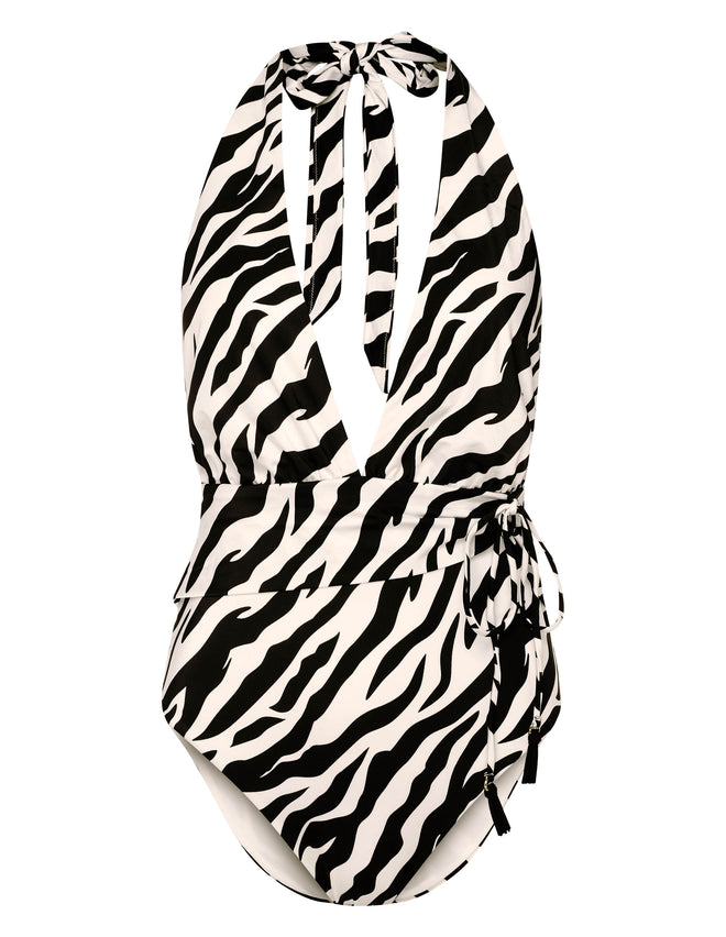 Цей купальник вражає своїм дизайном: глибокий V-подібний виріз спереду, повністю відкрита спина й драпірування на талії створюють елегантний та жіночний силует. Зав’язка на шиї дозволяє легко адаптувати модель до вашої фігури. Доступний у двох варіантах: анімалістичний принт зебри або класичний чорний.