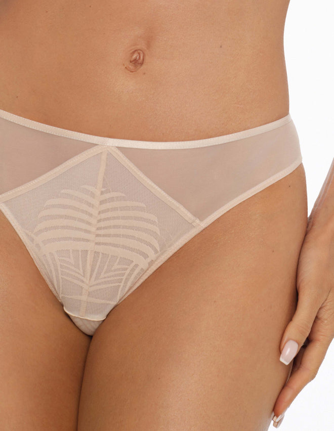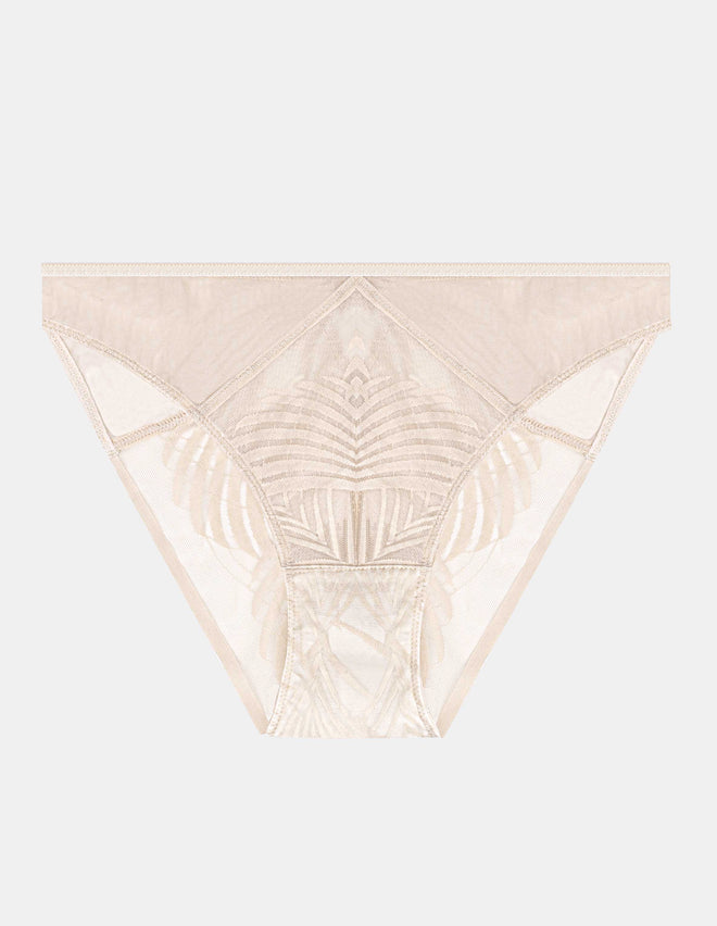 Трусики-сліпи Nacre - це елегантна модель, яка виконана з мережива і ніжної напівпрозорої сітки. Вони ідеально підходять для носіння під штани, спідниці або сукні завдяки своєму бежевому відтінку, який непомітний під одягом. Бавовняна ластовиця забезпечує комфорт протягом усього дня.