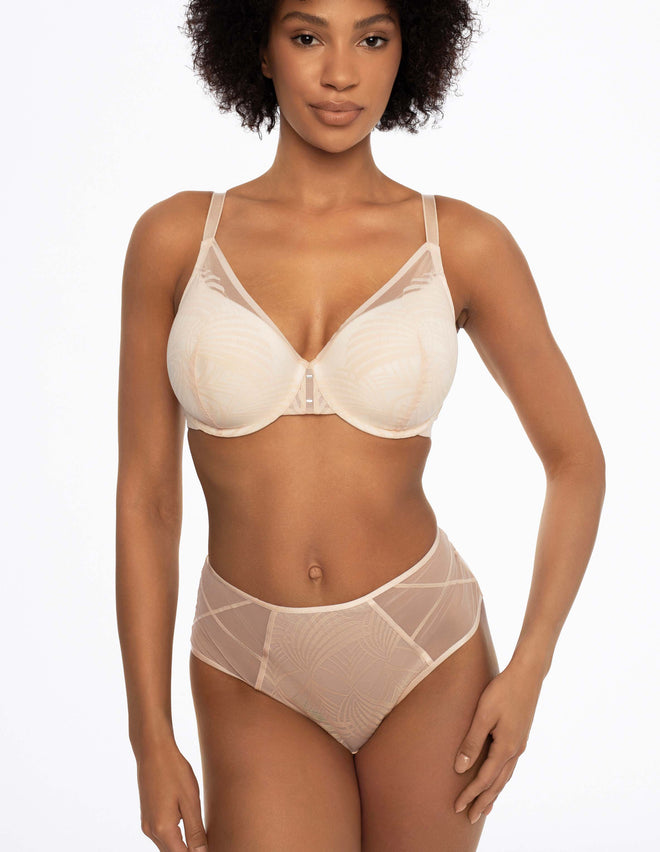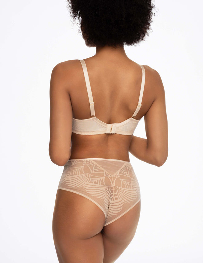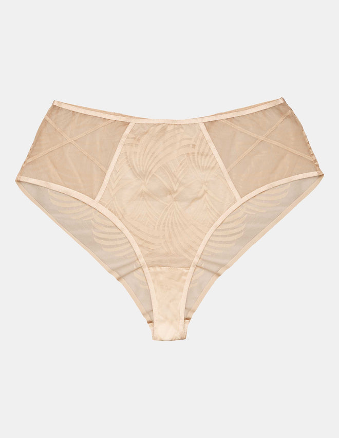 Трусики з високою талією Nacre в бежевому відтінку є ідеальним поєднанням шику та повсякденного комфорту. Їхня висока талія забезпечує не тільки зручність, а й делікатно підкреслює ваш силует. Оздоблені ніжним мереживом спереду та ззаду, ці трусики набувають особливої чарівності завдяки декоративній тасьмі.