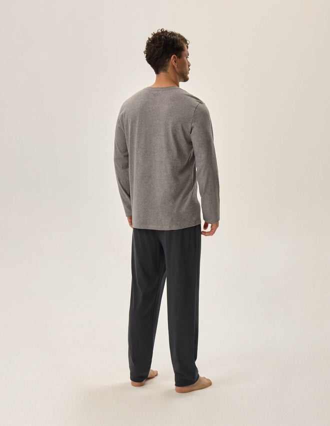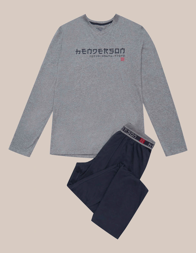 Чоловіча піжама Japan – ідеальний вибір для прихильників класики у повсякденному комфорті. Комплект виконаний у стриманих сірих тонах і складається з блузи з довгими рукавами та темних штанів до щиколоток. Завдяки м’якому бавовняному трикотажу піжама приємна на дотик і забезпечує комфортний сон. Елегантний акцент додає фірмовий напис на верхній частині комплекту.