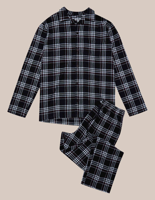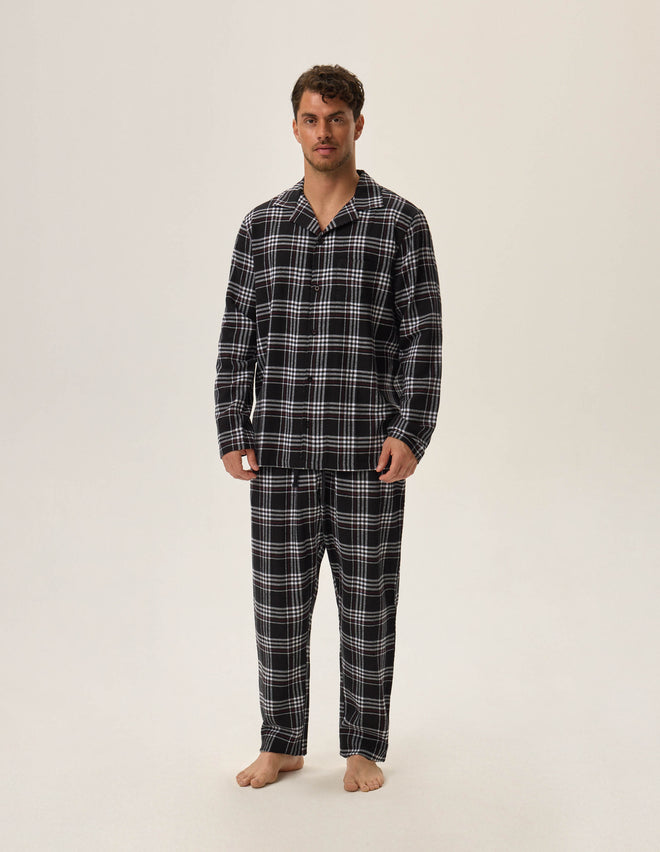 Чоловіча піжама Honor – це вишуканий класичний комплект, який поєднує стиль і комфорт. Складається з двох частин: довгі штани вільного крою забезпечують свободу рухів, а сорочка з довгими рукавами та комірцем додає елегантності. Нейтральний чорний колір із візерунком у клітинку створює стильний та сучасний вигляд. Виготовлена зі 100% бавовни, піжама не лише приємна на дотик, а й забезпечує природну циркуляцію повітря, роблячи ваш нічний відпочинок максимально комфортним.