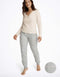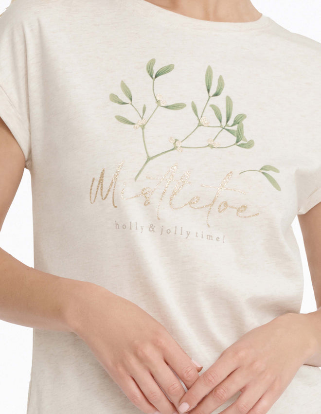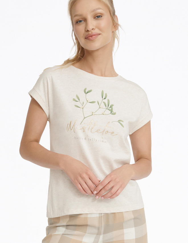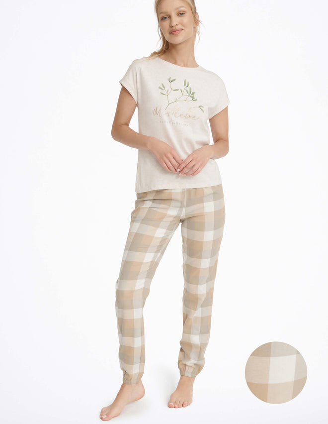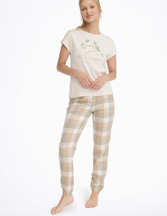 Різдвяна жіноча піжама Mallow - модель для всіх шанувальників грудневого настрою. Трикотажний топ пісочного кольору прикрашений написом та принтом омели. Чарівності додають блискучі елементи. Брюки вільного крою із зав'язками на штанинах виконані з картатої тканини. Вам також сподобаються яскраві кольори цього святкового піжамного комплекту.