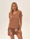 Жіноча піжама Jael – класичний вибір для теплих ночей, виконана в ніжних блакитних відтінках. Цей комфортний комплект складається з футболки з елегантним вирізом та коротких шортів, що мають оригінальну форму з делікатними вирізами. Цей комплект ідеально поєднує комфорт та сучасний стиль.