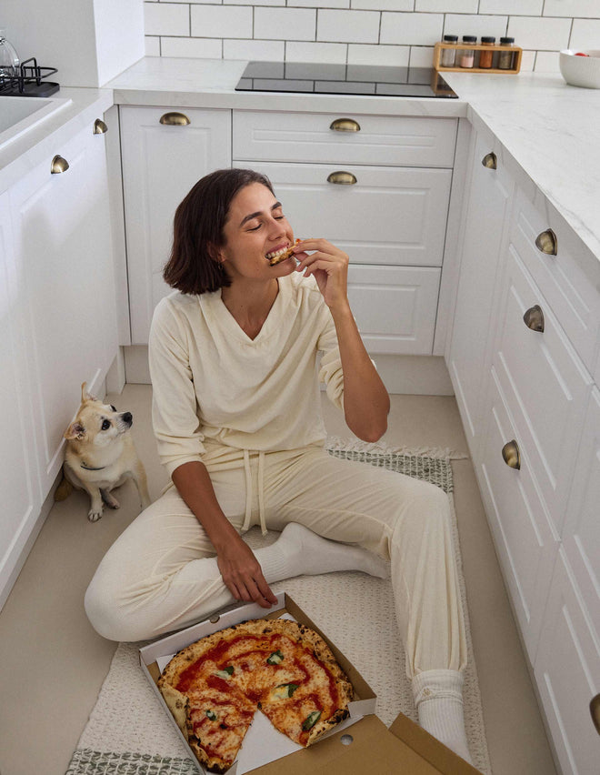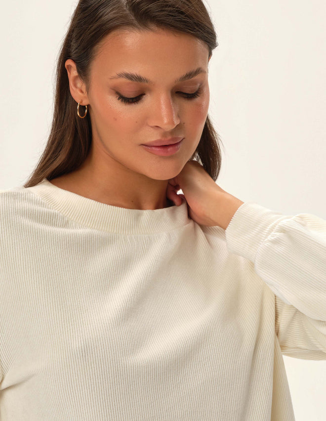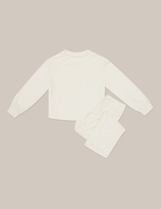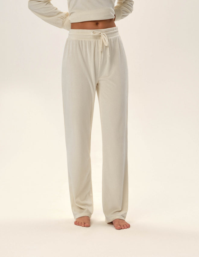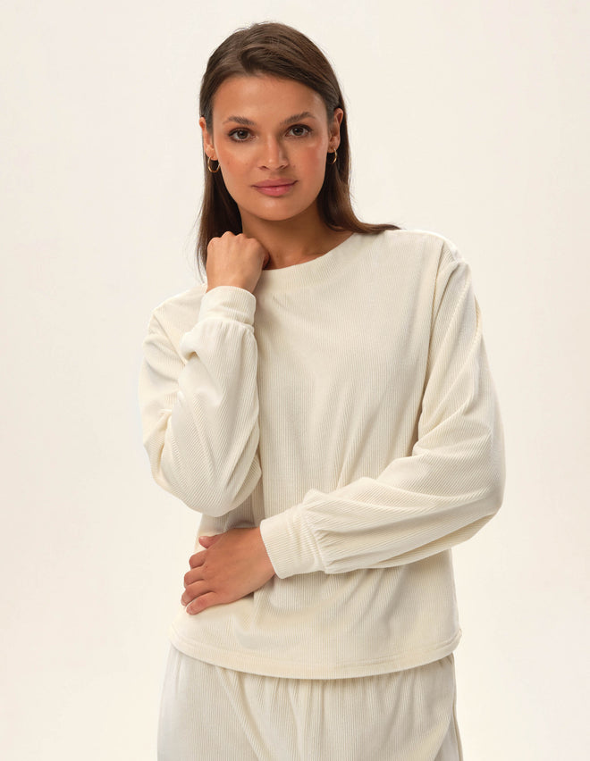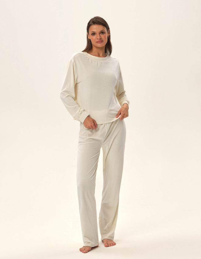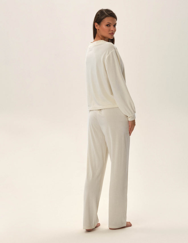 Відчуйте щоденний комфорт з жіночим велюровим комплектом Jade - вашим незамінним супутником для затишних осінніх та зимових вечорів. Комплект вільного крою складається з блузи з об'ємними рукавами та довгих брюк з прямими штанинами. Еластична резинка на талії забезпечує м'яку посадку. Одяг виготовлений з білого велюру, що ніжно огортає шкіру, даруючи приємне відчуття затишку.