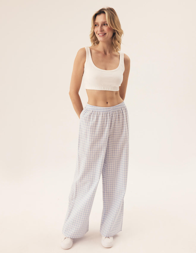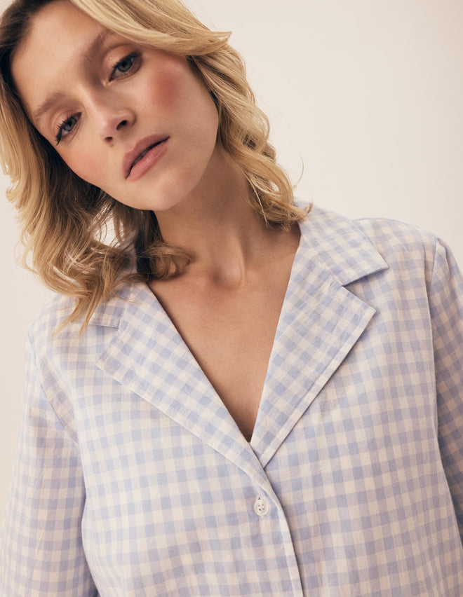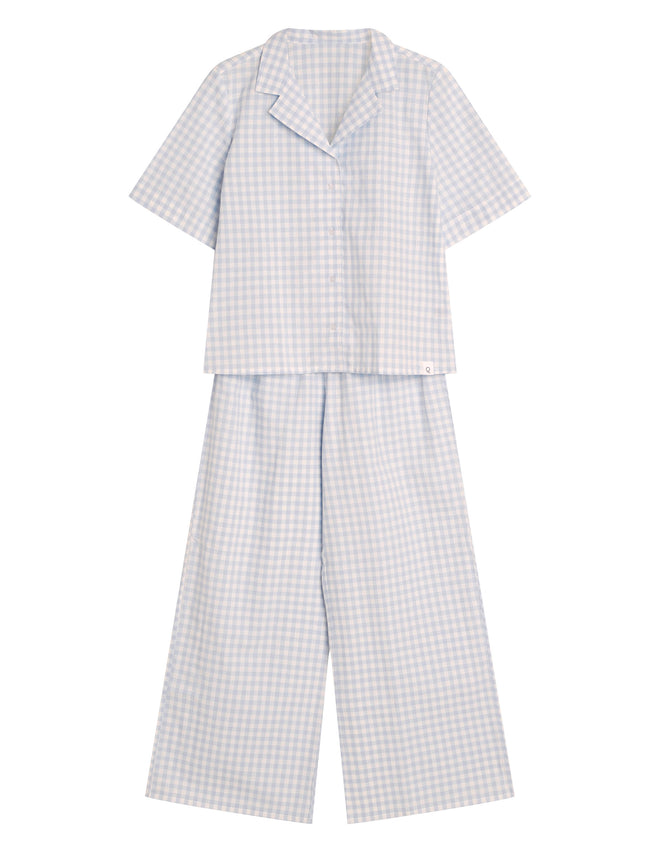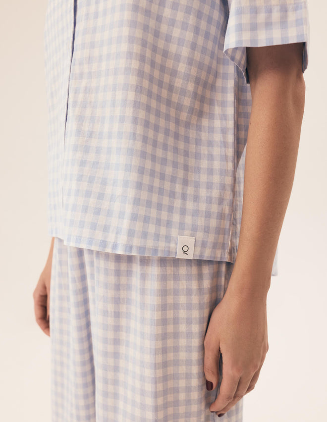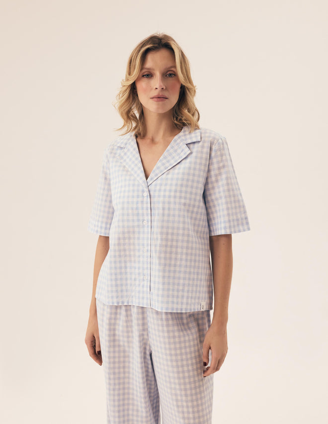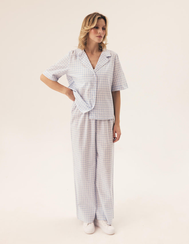 Класична піжама у біло-блакитну клітинку Rossini – втілення комфорту та елегантної простоти. Легкий, приємний до тіла матеріал забезпечує затишок у будь-яку пору року, а вільний крій брюк і сорочки дарує свободу рухів. Ідеальний вибір для стильного відпочинку.