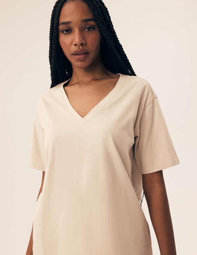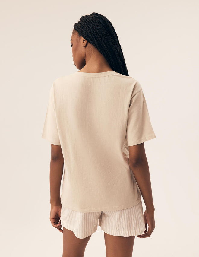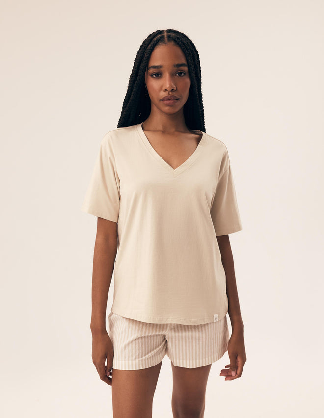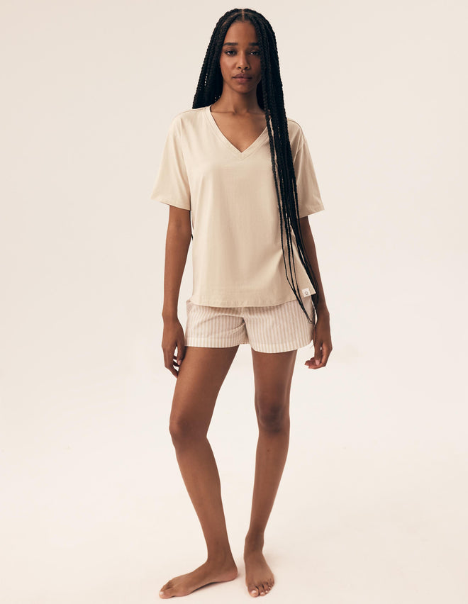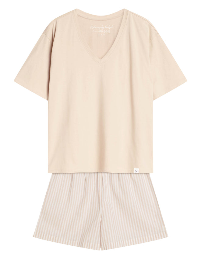Затишна та стильна піжама Rossini для справжнього комфорту. М'яка оверсайз футболка з V-подібним вирізом ніжно прилягає до тіла, а шорти у бежеву смужку додають легкості та тепла образу. Ідеальний комплект для розслаблених вечорів і приємних ранків.