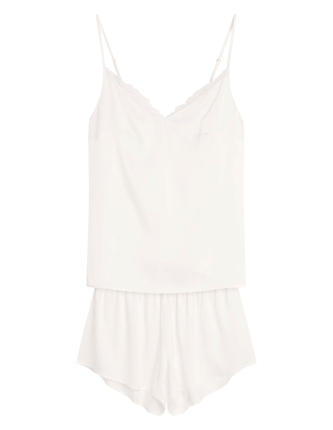 Комплект складається з сатинової майки на тонких бретелях і шортиків із м’якого білого сатину. Мереживні вставки додають чуттєвості, а вільний крій дарує повну свободу рухів.