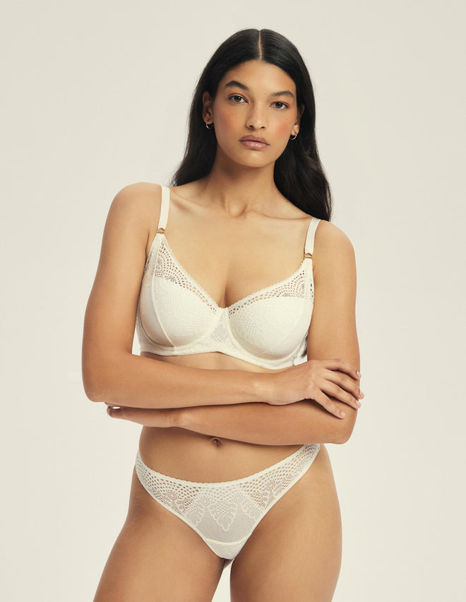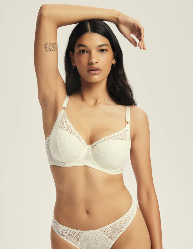 Ніжний, немов ранковий туман, бюстгальтер Marvela в відтінку екрю поєднує делікатність мережива з практичністю щоденної білизни. Конструкція на кісточках забезпечує надійну підтримку, а ущільнені чашки м’яко огортають груди, підкреслюючи їхню природну форму. Вишуканий квітковий візерунок ажуру плавно переходить у сітчасту структуру з графічними акцентами, додаючи образу легкості та елегантності. Ця модель вражає не лише стилем, а й ідеальною посадкою.