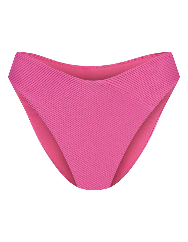 Ці рожеві плавки мають актуальний асиметричний дизайн із м’якої текстурованої тканини. Завищена лінія талії візуально подовжує ноги, а косий крій додає стилю та робить силует виразнішим.