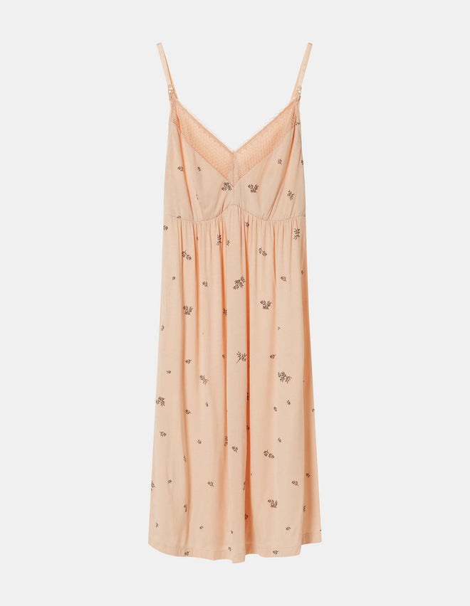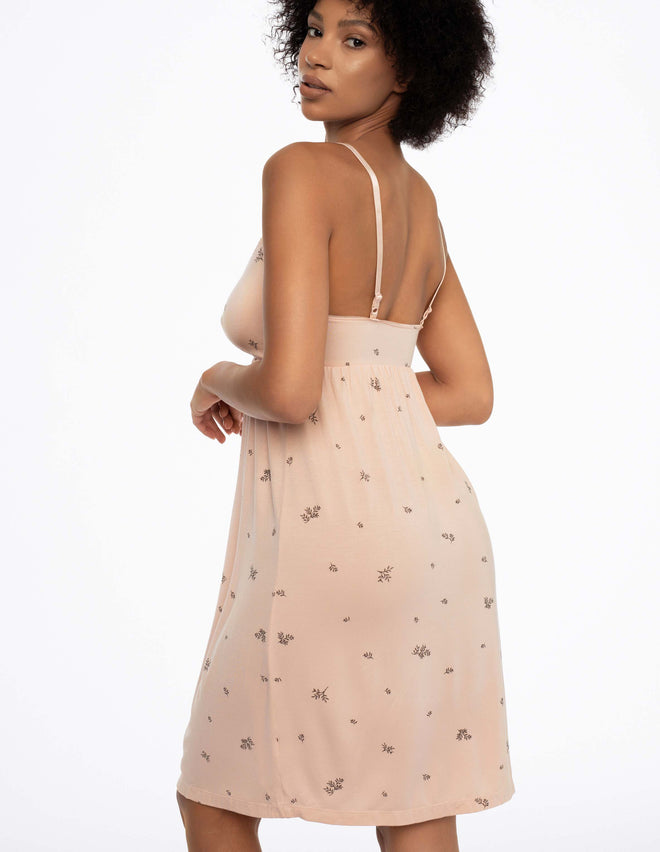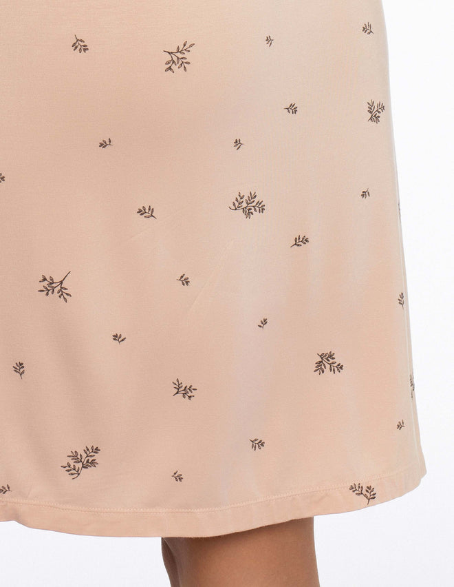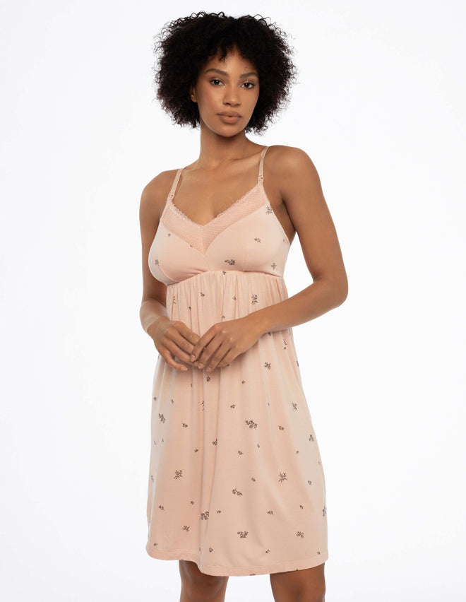 Шукаєте зручну нічну сорочку з натурального матеріалу? Зверніть увагу на світлу ночнушку Dorine. Ця модель поєднує в собі сорочку та топ для годування, пропонуючи комфорт та стиль. Чашечки можна швидко й легко відстебнути, що є великою перевагою для годуючих мам. Верх чашечок прикрашений геометричним мереживом, а бретелі з легким блиском додають елегантності. Ніжний принт у листочок завершує вишуканий образ.