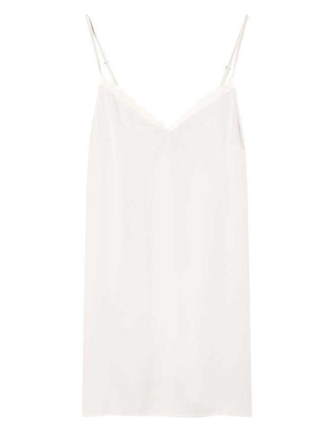 Виконана з білого сатину з м’яким блиском, вона ніжно облягає тіло, а тонкі бретелі та витончене мереживо додають образу делікатності та шарму.