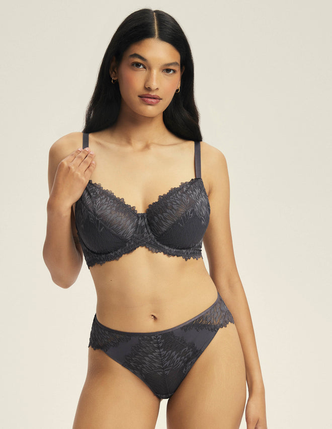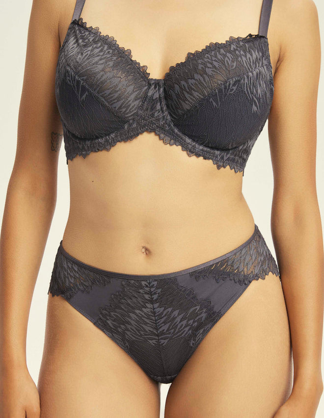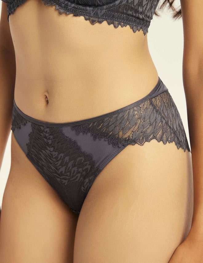 Високі трусики Ofiel у сірому відтінку поєднують сучасний крій із витонченими деталями. Напівпрозора спинка з ажурним візерунком огортає силует легкою елегантністю, а передня частина з поєднанням гладкої тканини та мереживних вставок гармонійно моделює лінію стегон. Висока посадка дарує відчуття комфорту й м’яких обіймів, водночас акцентуючи талію. Це чуттєва гра світла й фактур, у якій романтичність зустрічається зі стриманою сучасністю.