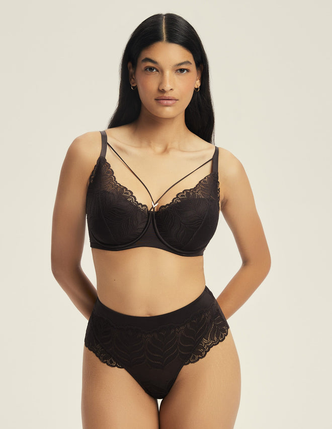 Бюстгальтер Korin — елегантність, підкреслена глибоким бронзовим відтінком. Модель захоплює мереживними чашками з рослинним мотивом, а декоративні смужки біля декольте додають образу легку драматичність. Ущільнені чашки з кісточками забезпечують надійну підтримку та комфорт протягом дня, а регульовані бретелі дозволяють точно налаштувати посадку. Поєднання тонкого мережива й насиченого кольору створює благородний, вишуканий характер білизни.