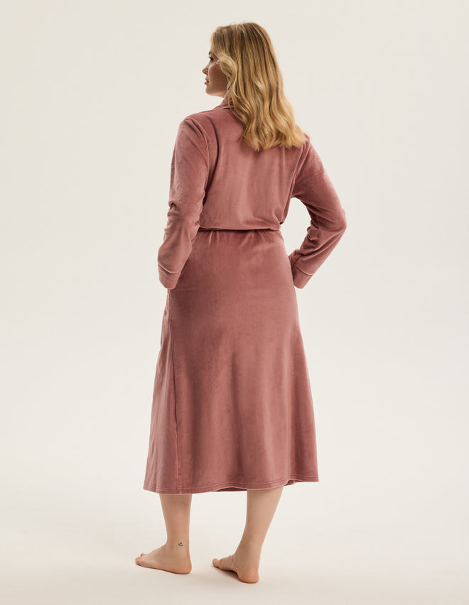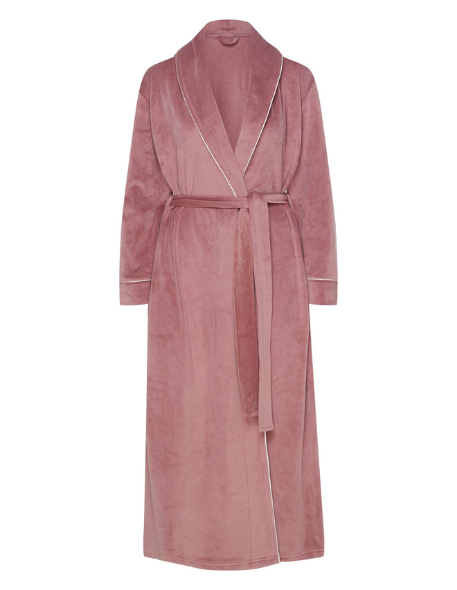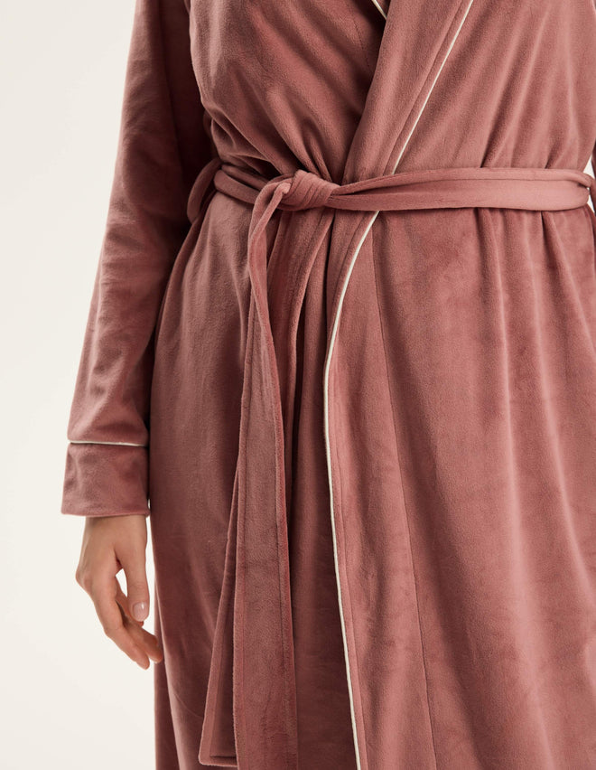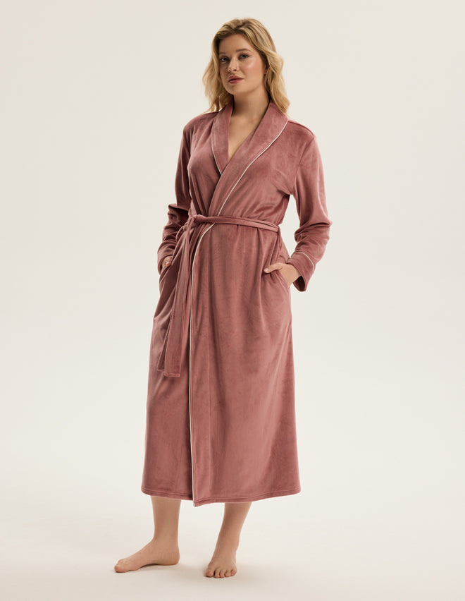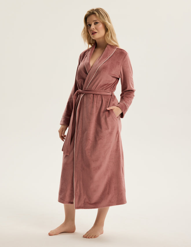 Жіночий халат Reva — це поєднання стриманої розкоші й домашнього комфорту. Максі-довжина до щиколоток візуально витягує силует, а зав’язка на талії делікатно підкреслює природні жіночні форми.