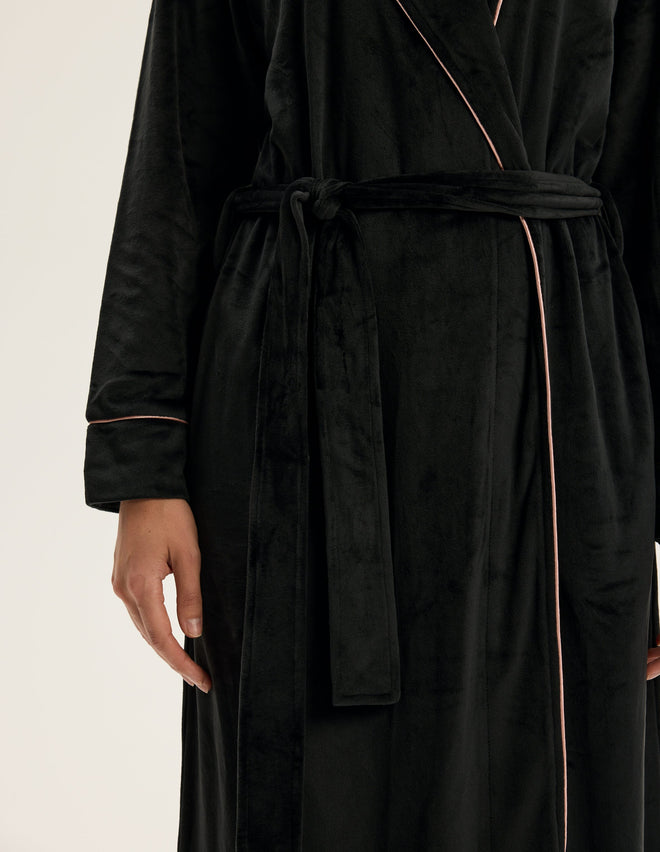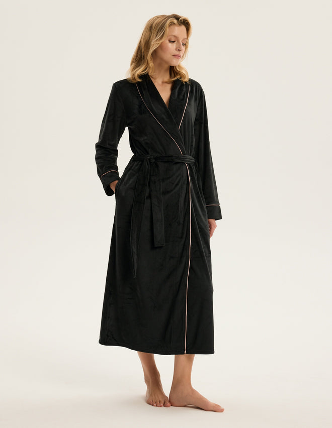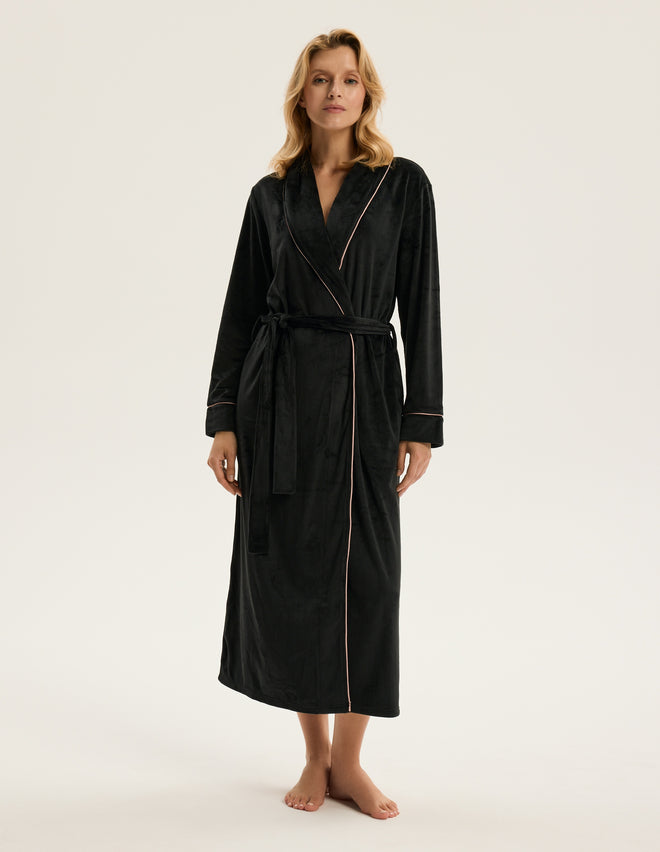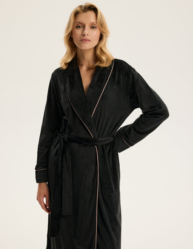 Контрастна облямівка вздовж коміра та манжетів додає образу витонченості та створює ефект вишуканого мінімалізму. М’яка приємна тканина огортає тіло, роблячи ранкові ритуали та вечірній відпочинок ще більш затишними.