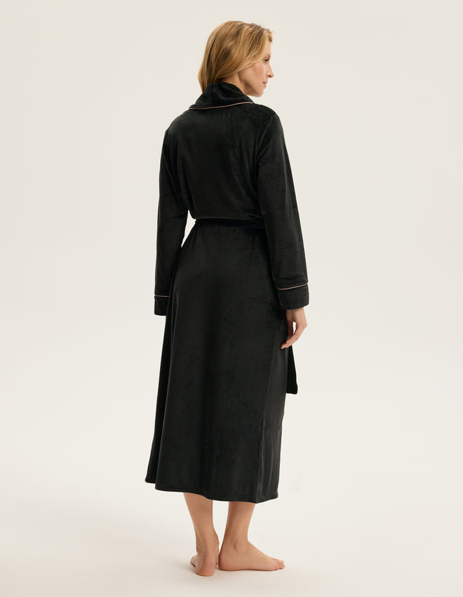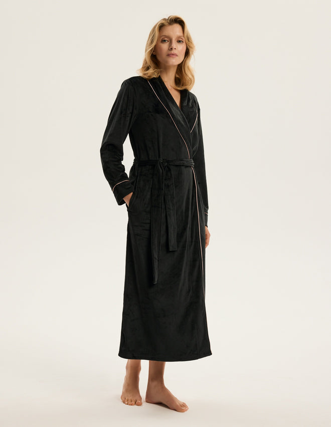 Жіночий халат Reva — це поєднання стриманої розкоші й домашнього комфорту. Максі-довжина до щиколоток візуально витягує силует, а зав’язка на талії делікатно підкреслює природні жіночні форми.