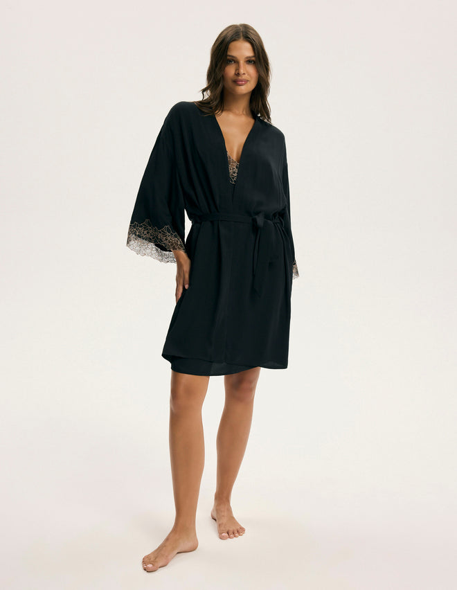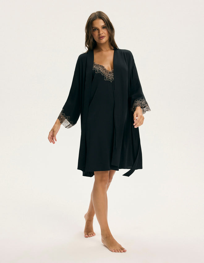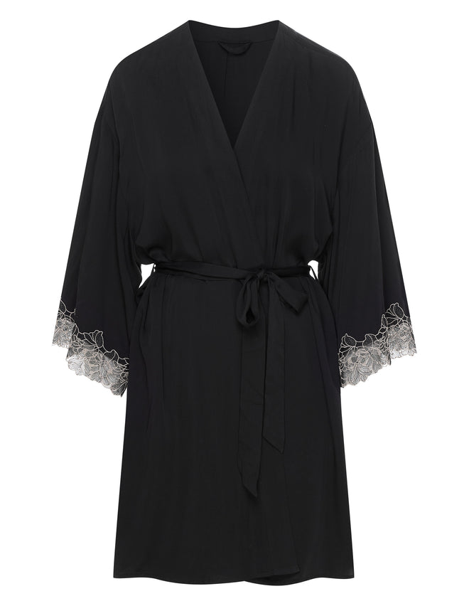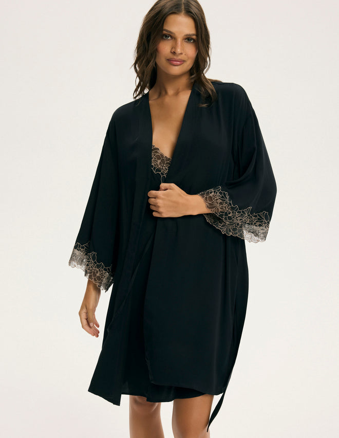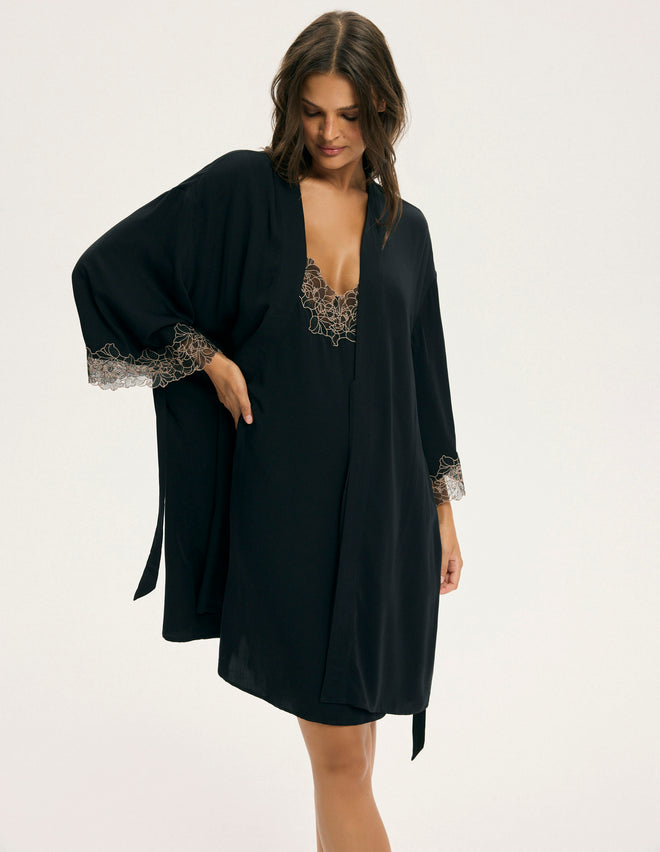 Вільний крій і широкі рукави, оздоблені мереживом у відтінку шампанського золота, відсилають до класичного кімоно — образу, де простота поєднується з вишуканістю та внутрішньою гармонією. Пояс дозволяє адаптувати посадку: підкреслити талію або створити більш розслаблений силует.
