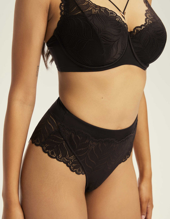 Високі трусики Korin — вишукана чуттєвість у форматі високої талії. Модель поєднує гладкий еластичний матеріал і мереживні вставки з квітковим мотивом. Передня частина делікатно моделює силует, а витончене мереживо з боків візуально подовжує лінію ніг. М’який пояс надійно фіксує посадку й залишається ніжним до тіла, даруючи комфорт упродовж дня.