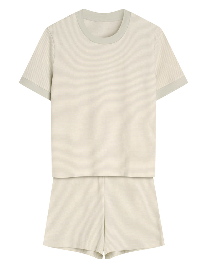 Легка піжама з м'якого бавовняного трикотажу Reese. Класичний комплект: футболка з коротким рукавом та шорти з еластичним поясом. Контрастні манжети додають акценту. Ідеальна для домашнього відпочинку та спокійного сну.