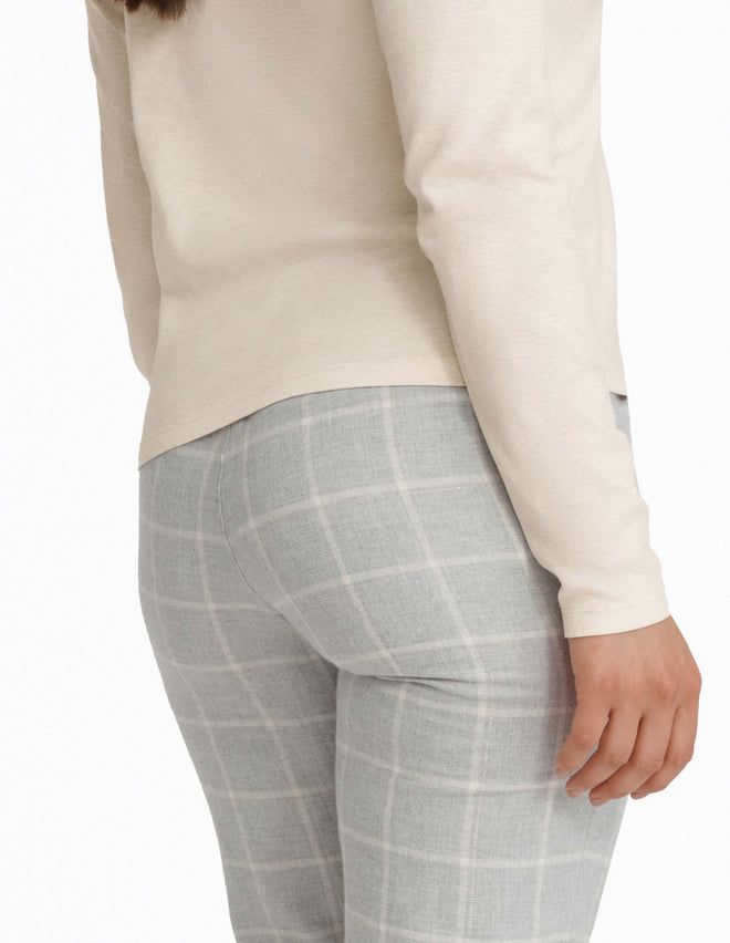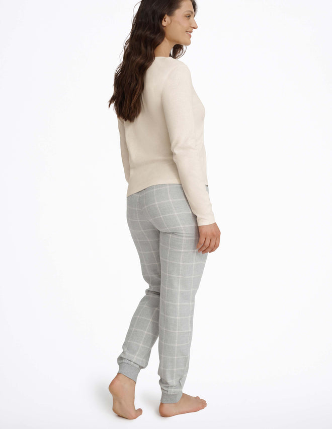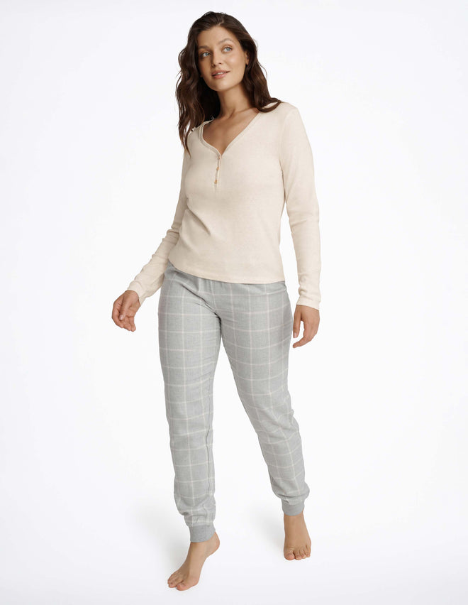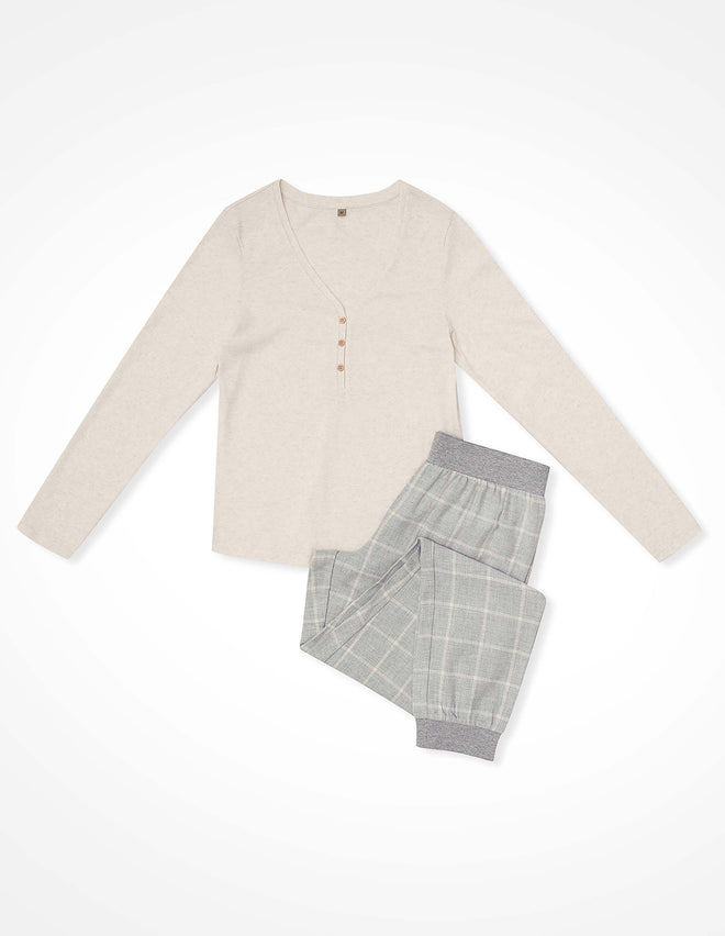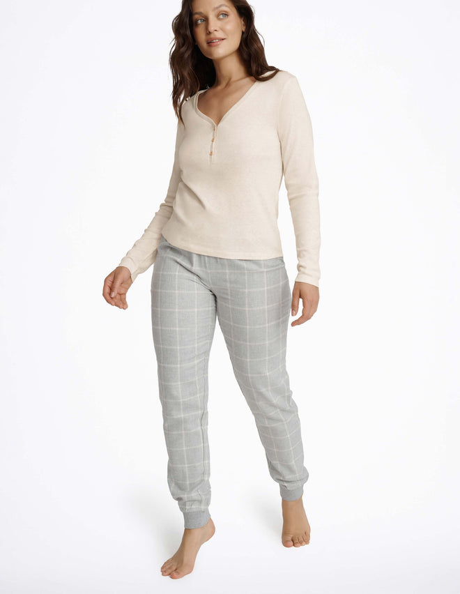 Жіноча піжама Magically для жінок, які цінують комфорт та мінімалізм. Класичний кремовий лонгслів, оздоблений дерев'яними ґудзиками, поєднується з довгими брюками в клітинку. Поєднання сірого та бежевого на брюках розбито золотою ниткою, що робить піжаму з довгим рукавом Magically надзвичайно елегантною. Штани доповнені ребристими манжетами, тому ви можете забути про набридливе скручування піжами під час сну. Весь комплект виготовлений з приємної до тіла, м'якої бавовни.