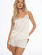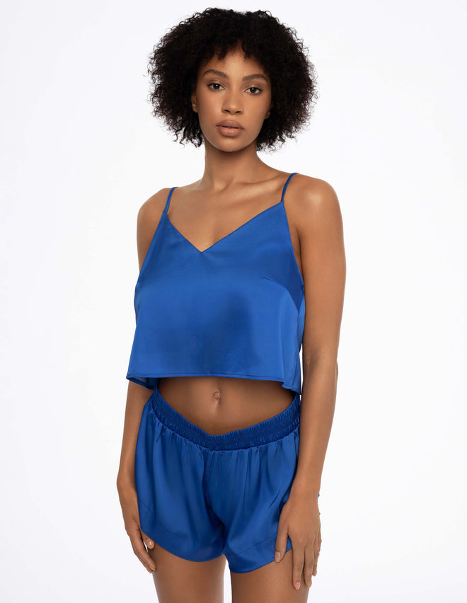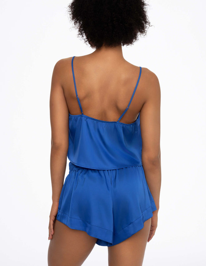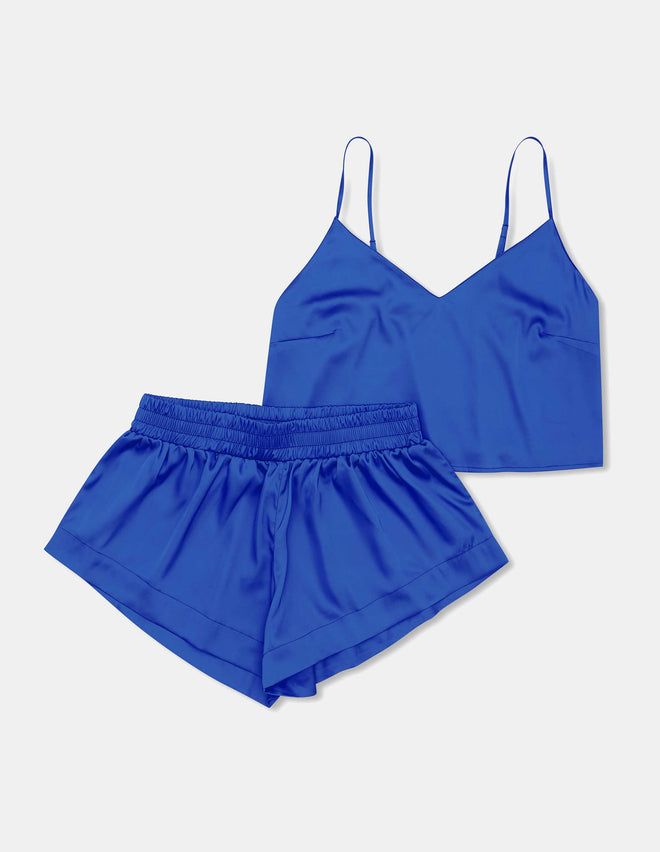 Атласна піжама Doll захоплює насиченим синім кольором, який красиво підкреслить тон вашої шкіри. Короткий топ вільного крою з V-подібним вирізом спокусливо оголює частину живота, дозволяючи вам почуватися комфортно навіть у найспекотніші ночі. Зручні, м'які шорти ніжно підкреслюють стегна, додаючи образу нотку екстравагантності.