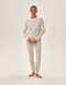 Відчуйте справжній комфорт у жіночому піжамному комплекті Jeda, що складається з двох предметів: довгих штанів та блузи з довгими рукавами. Піжама має класичний, універсальний крій з широками штанинами, забезпечуючи вільний рух та затишок. Виготовлена зі 100% дихаючої бавовни, вона дарує легкість і комфорт для спокійного сну.