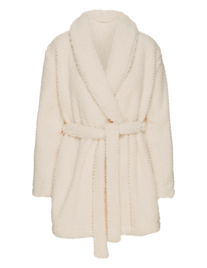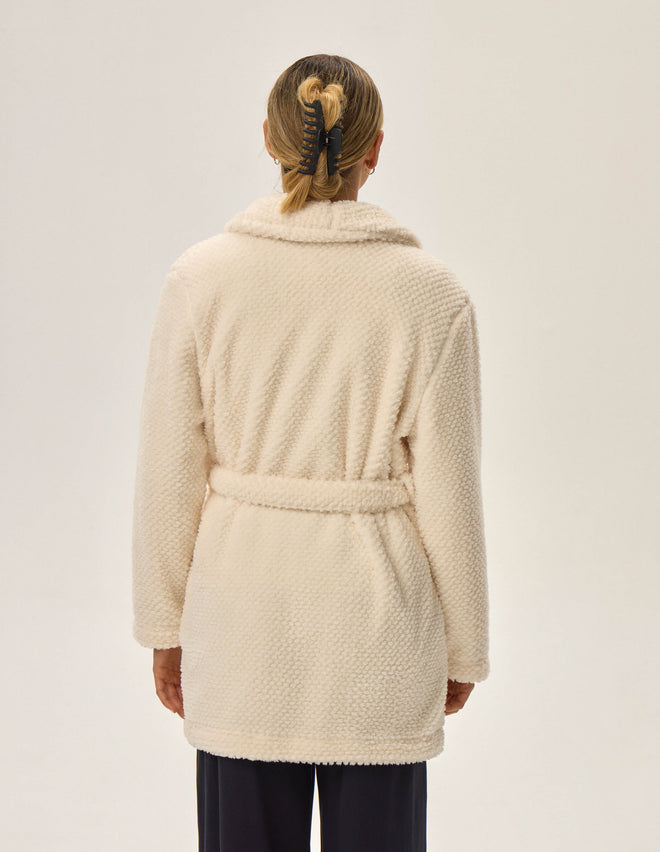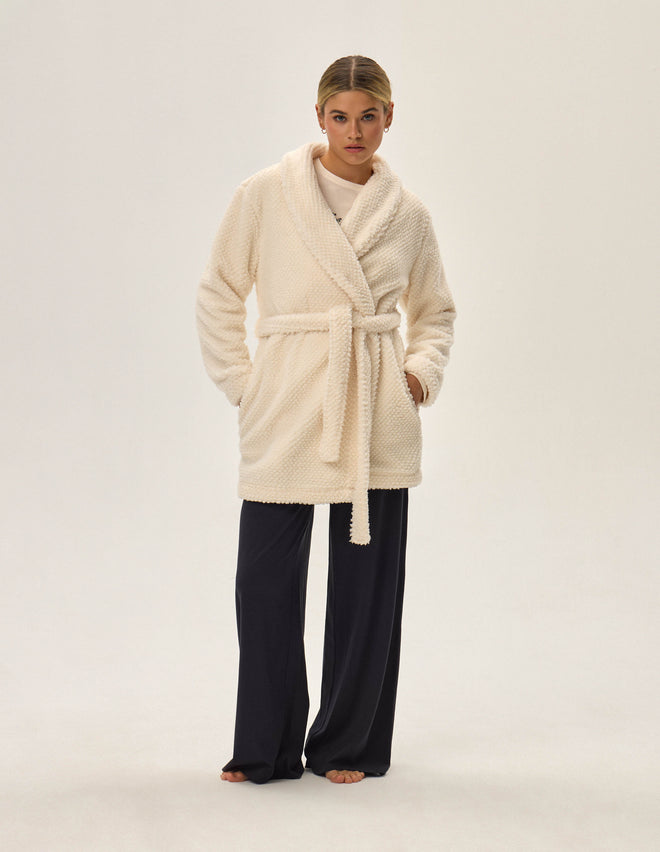 Теплий халат Jamie стане вашим затишним супутником прохолодного вечора, огортаючи так само м’яко, як улюблений светр. Виготовлений із м’якого трикотажу, цей халат нагадує плюшевого ведмедика на дотик. Він має довгі рукави, шалевий виріз без капюшона та універсальний світлий відтінок, що легко комбінується з вашим домашнім стилем. Укорочений крій робить халат Джеймі чудовим вибором як для пари з піжамою, так і для поєднання зі спальним комплектом.