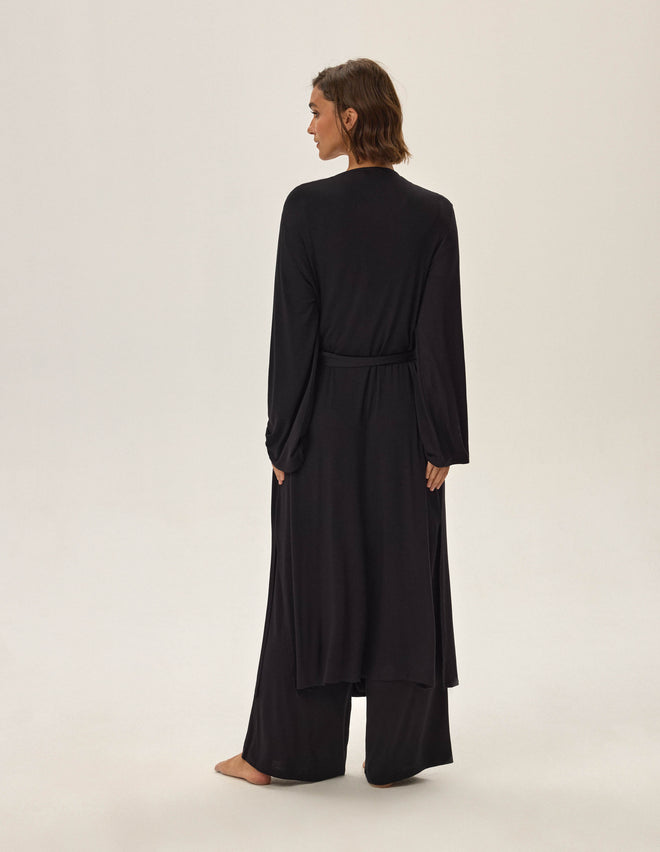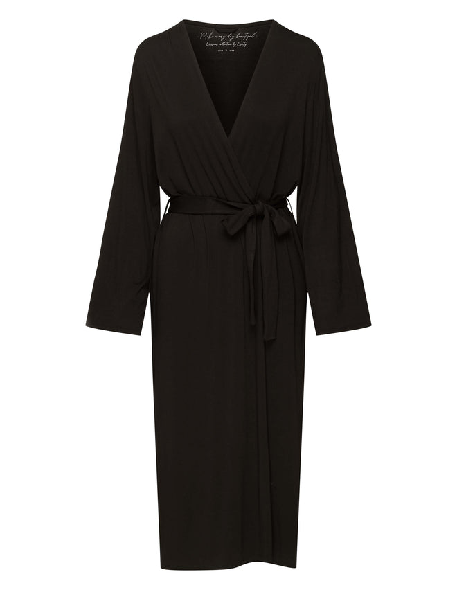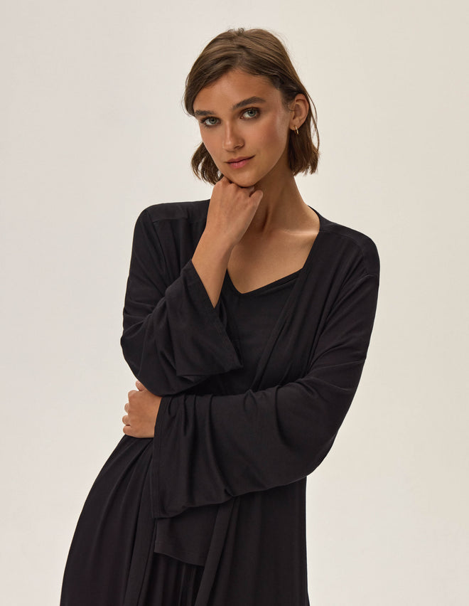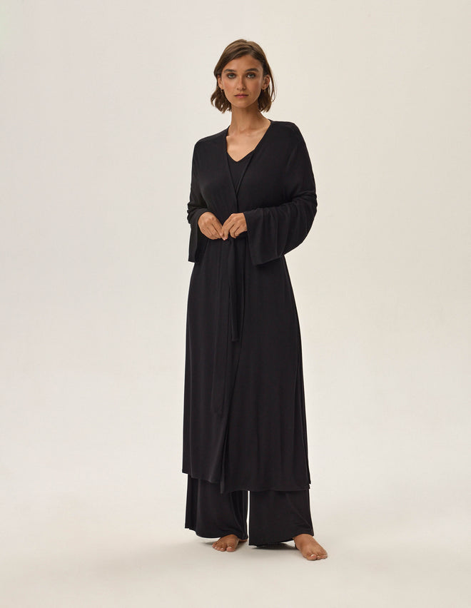 Чорний халат Juliette з довгими рукавами створений із м'якої віскозної тканини з еластаном, що ідеально підлаштовується під ваш силует. Легкий і ніжний матеріал огортає тіло, забезпечуючи максимальний комфорт без обмеження рухів. Для ще більшої зручності халат можна зав'язати широким поясом, додаючи витонченого акценту до вашого образу.