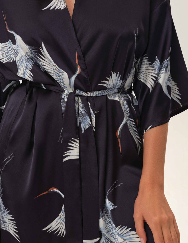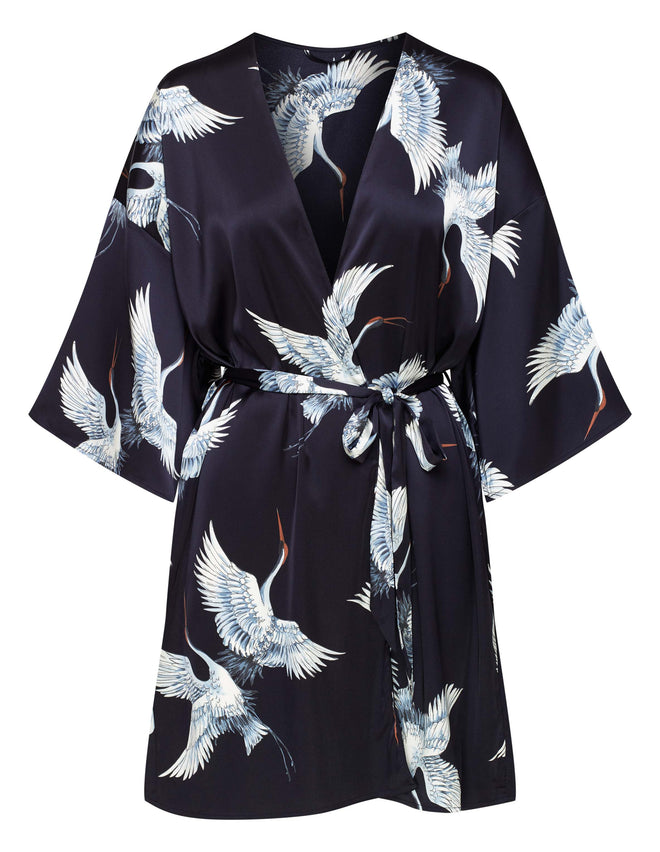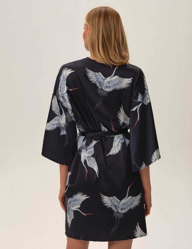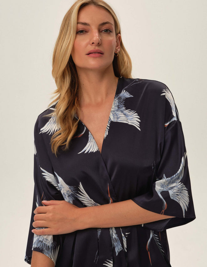 Шукаєте легкий халат, який можна затишно накинути після ванни? Жіночий халат Jael у синьому кольорі – це ідеальний вибір. Виготовлений з ніжної атласної тканини, він м’яко огортає тіло, даруючи приємні відчуття на шкірі. Короткий халат класичного крою, з поясом на талії, забезпечує ідеальну посадку, поєднуючи елегантність з комфортом. Цей стильний халат підходить для домашнього відпочинку або розслабленого вечора після водних процедур.