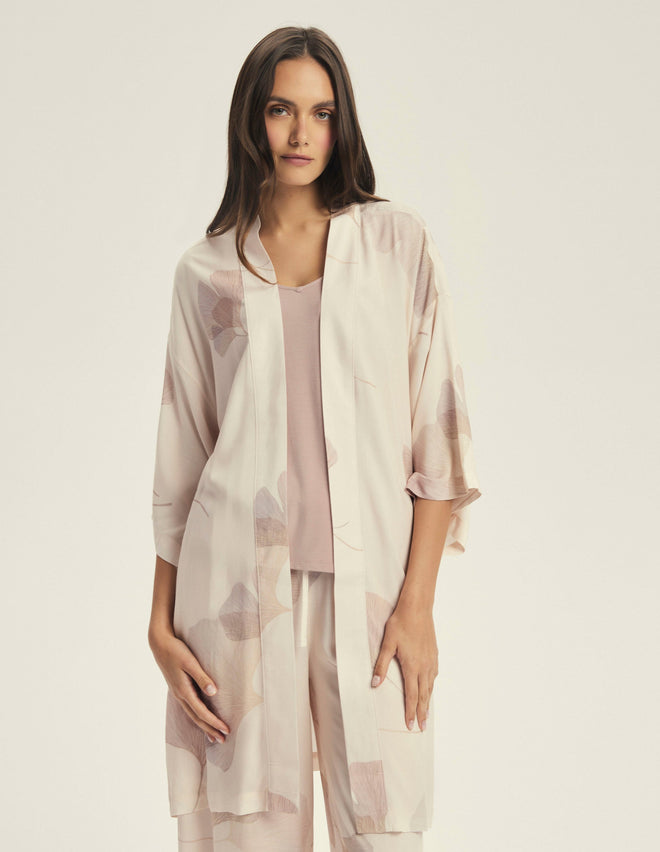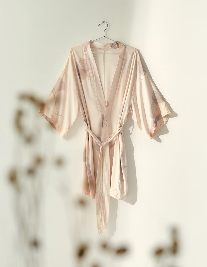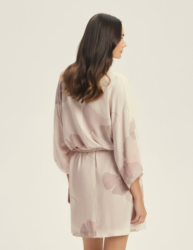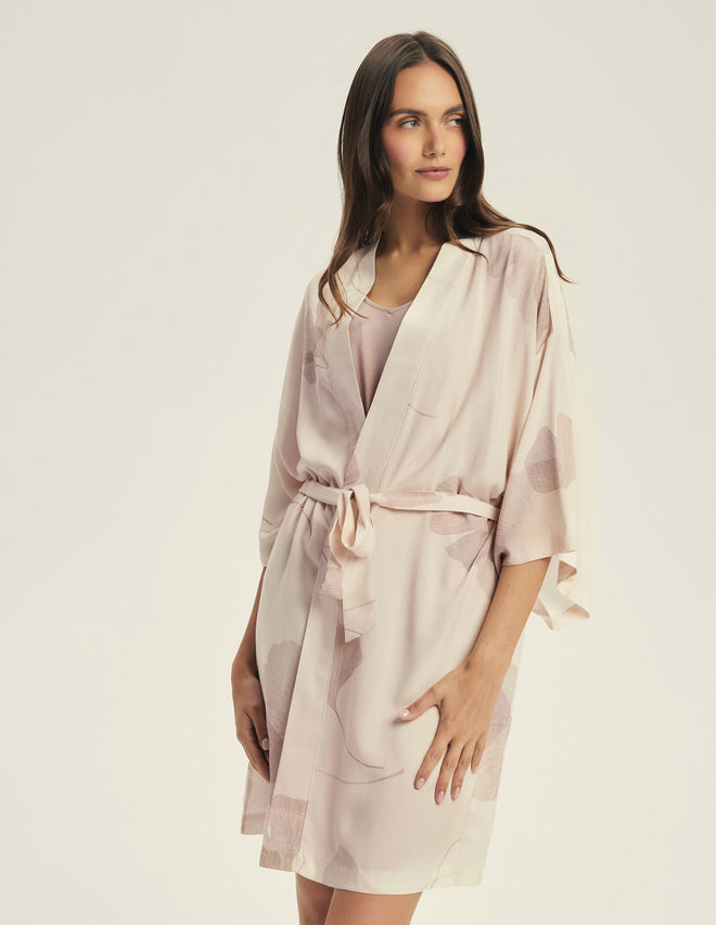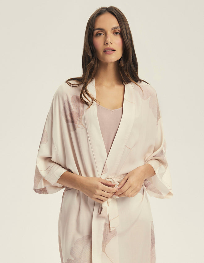Халат Cossato у ніжному рожевому відтінку з квітковим візерунком створений для легкості та комфорту. Легка віскозна тканина приємна до тіла та дарує відчуття натуральності. Фасон на запах із поясом дозволяє регулювати посадку, підкреслюючи талію, а рукави 3/4 додають зручності у щоденному носінні. Довжина до колін робить модель універсальною – для дому, відпочинку чи ранкових ритуалів краси.