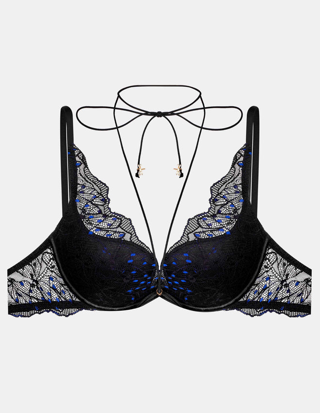 Поєднання стилю, комфорту й оригінальності - ось що робить бюстгальтер Nuka настільки привабливим. Його м'які чашки, що вкриті двокольоровим мереживом, не тільки підкреслюють форму грудей, а й забезпечують неперевершений комфорт протягом усього дня. Декоративні ремінці, які прикрашені витонченими аксесуарами у вигляді бабок, додають тендітності. До того ж, їх можна зав'язувати найнезвичайнішими способами: перехрещувати їх під бюстом, носити навколо шиї або фіксувати ззаду через кільця біля основи бретелей.