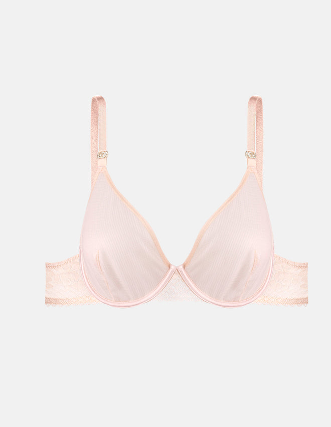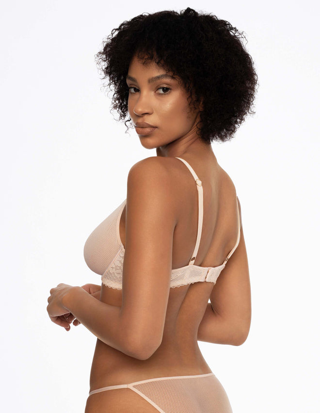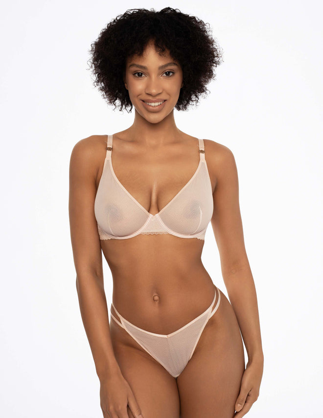 Бюстгальтер Nickita привертає увагу завдяки своєму вишуканому дизайну та практичності. Бежевий відтінок підкреслює його універсальність, а м'яке геометричне мереживо додає нотку вишуканості. Елегантний вигляд йому надає декоративна перемичка та комфортні широкі бретельки із золотими кільцями.