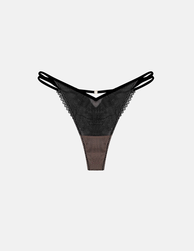 Не можете вирішити між класичним та сучасним дизайном мережива? Стрінги Nickita пропонують ідеальне рішення, поєднуючи в собі найкращі риси обох стилів. Їхня задня частина прикрашена квітковим мереживом, тоді як передня - геометричним візерунком з вишуканим дизайном. Тонкі подвійні резинки, що з'єднують обидві частини моделі, ефектно підкреслюють талію. Крім того, зверніть увагу на фурнітуру та незвичайний трикутний виріз ззаду.