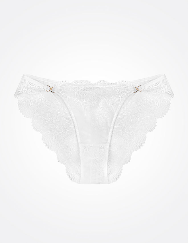 Білі трусики Ramira - це справжнє втілення елегантності. Виготовлені з ніжного квіткового мережива, ці трусики виділяються прекрасними подвійними обручами золотистого відтінку. Цей витончений декор не тільки слугує стильною прикрасою, а й вишукано з'єднує передню і задню частини трусиків.