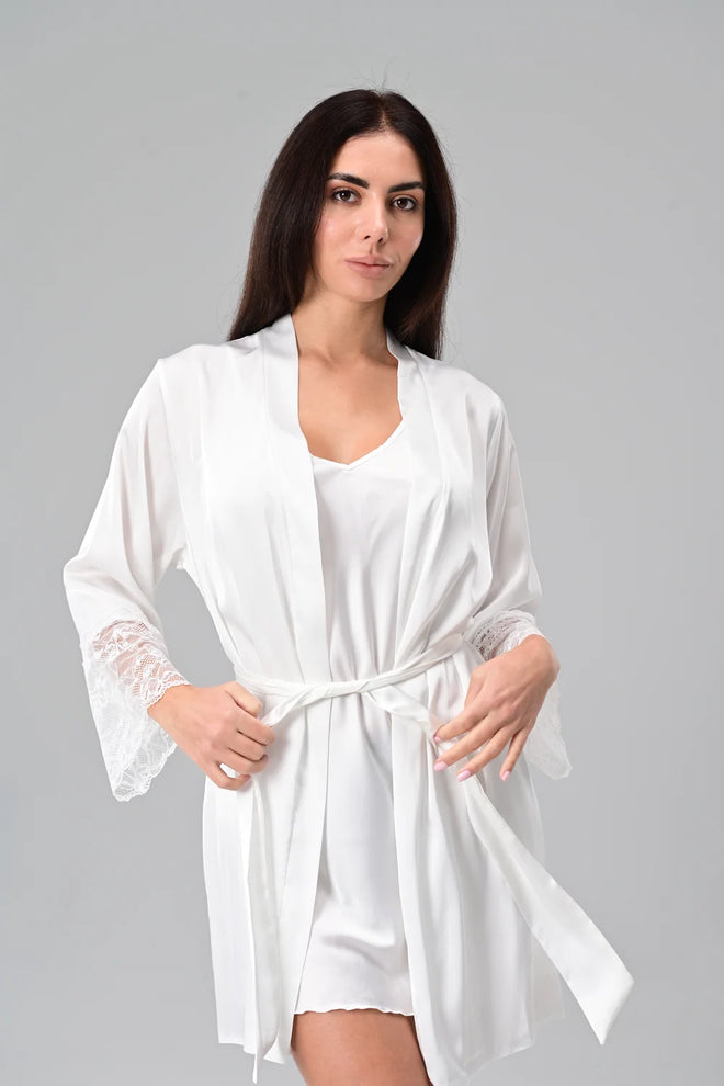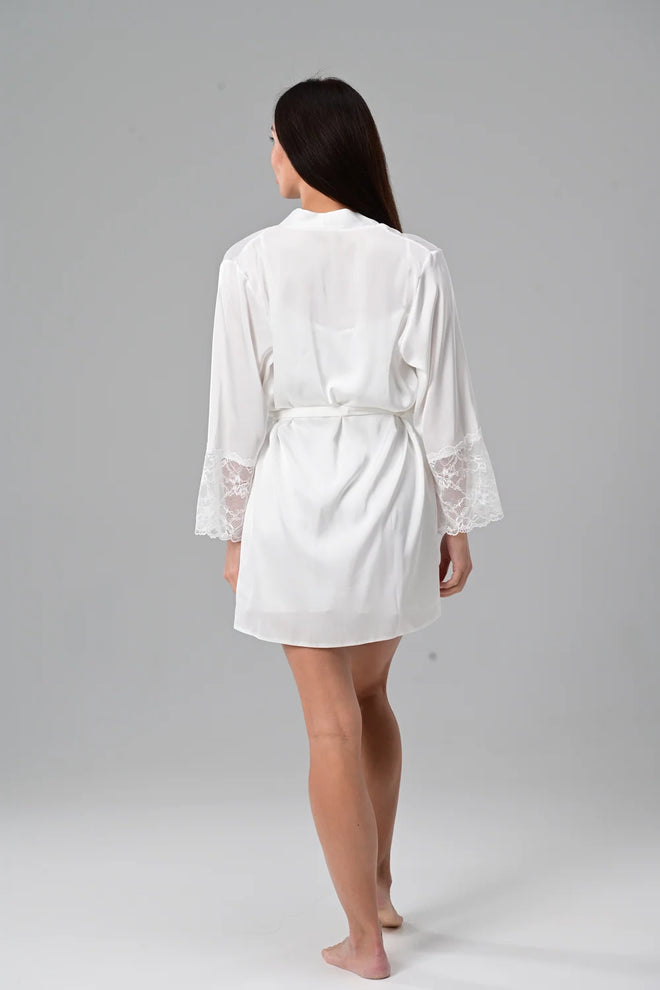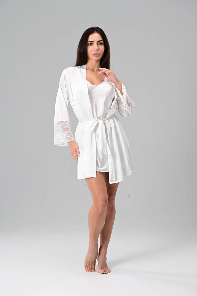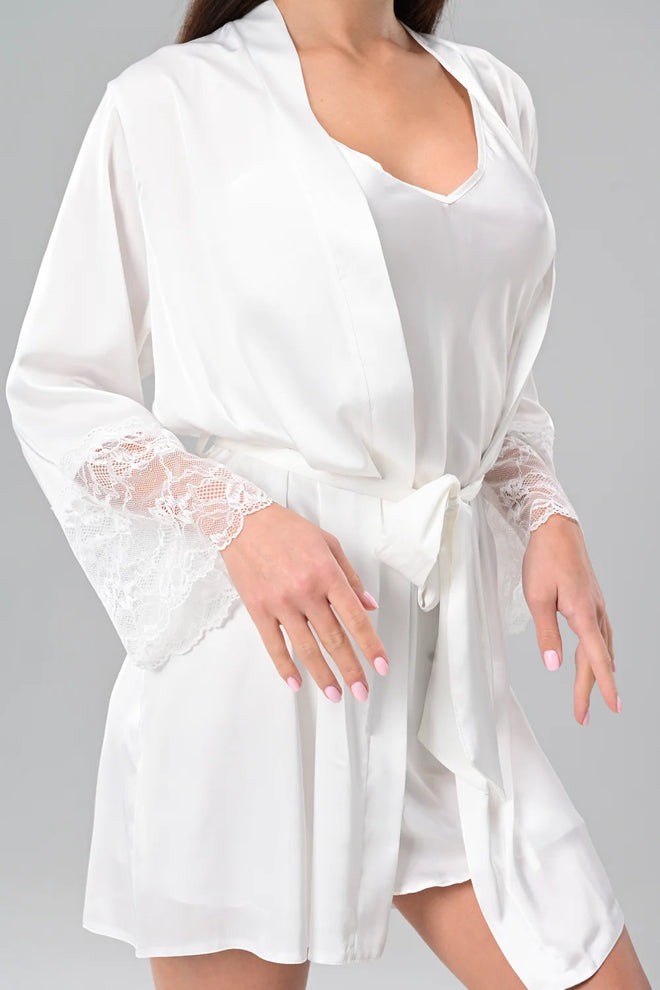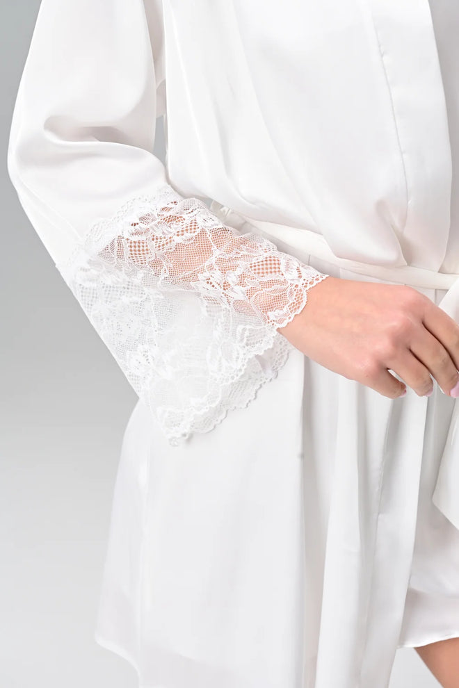 Короткий атласний халат кольору шампань, прикрашений делікатним мереживом на рукавах. Ідеальний для ранкових ритуалів, вечірнього релаксу та особливих моментів.