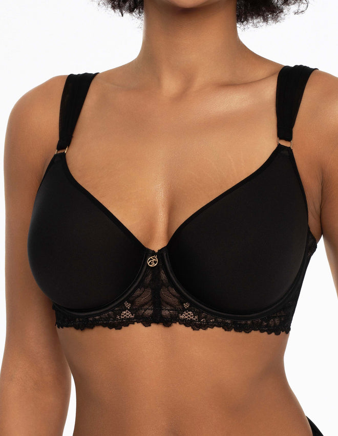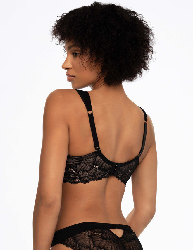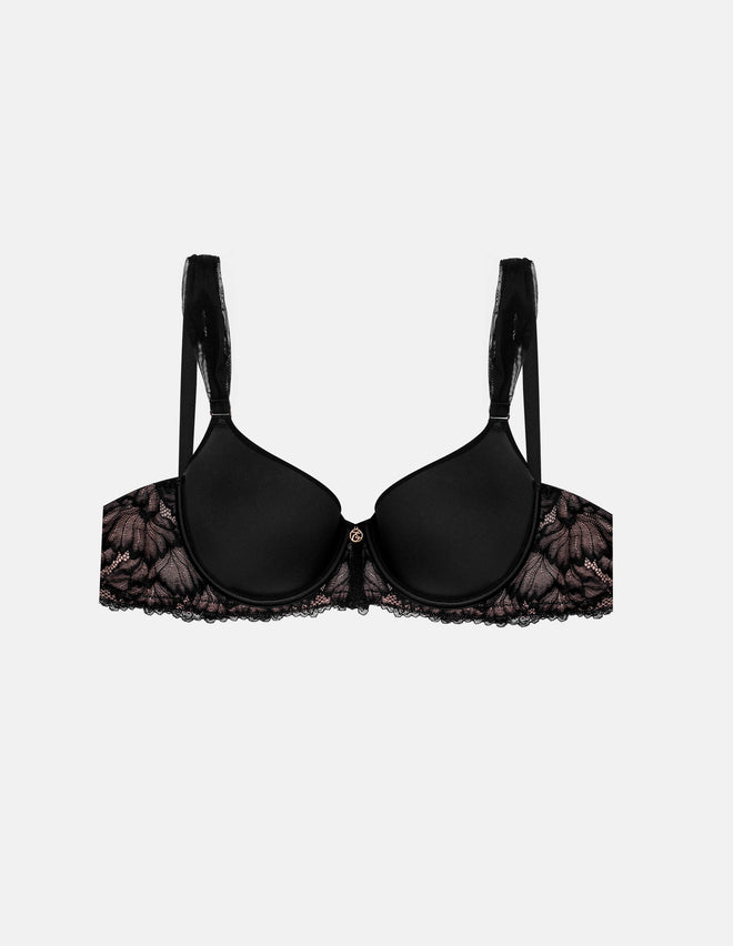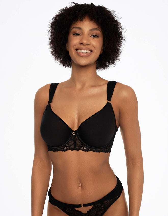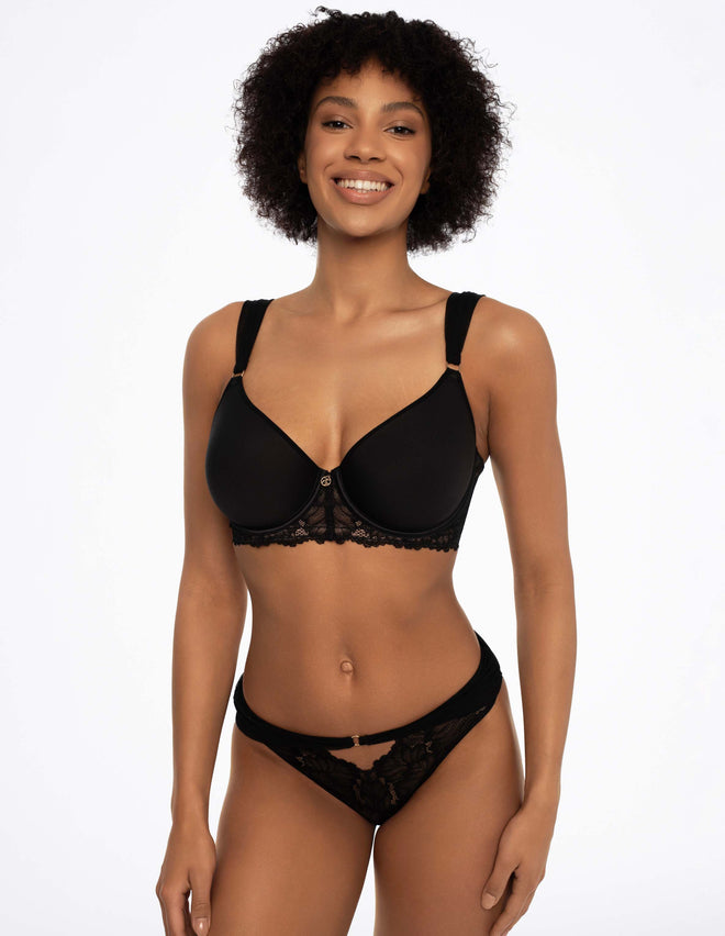 Ущільнений бюстгальтер Neo - це елегантна білизна чорного кольору. Широкі буфи та повні чашечки забезпечують відмінну підтримку бюста. Подовжені бретельки-буфи з додатковим шаром сітки не лише забезпечують комфорт під час носіння, а й мають чудовий вигляд. Гладкі та зручні чашечки поєднуються з витонченим квітковим мереживом. Бюстгальтер прикрашений чарівними золотими елементами, що додає йому особливого шарму.