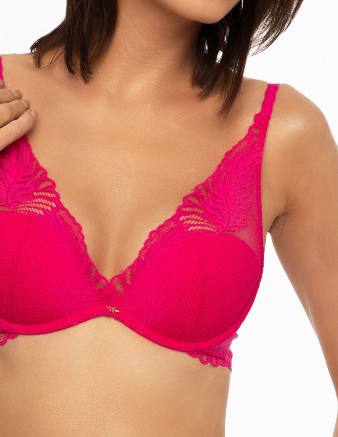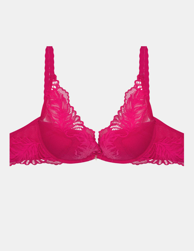 Narcise - це модель з пуш-апом, яка візуально піднімає та підкреслює груди. Гладенькі чашечки, прикрашені ніжним романтичним мереживом з великим візерунком з листя, роблять цей бюстгальтер ідеальним для особливих випадків. Доповнює образ вишуканий металевий листочок між чашечками. Насичений колір бюстгальтера ідеально контрастує з відтінком шкіри, створюючи вражаючий ефект.
