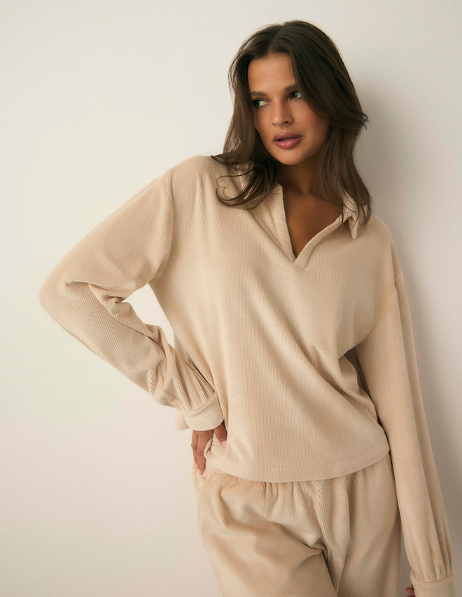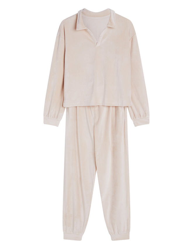 Домашній костюм Cora поєднує комфорт та сучасну естетику. М’яка тканина з ледь помітним блиском виглядає благородно та дарує приємні відчуття на шкірі. Верх з коміром поло та довгими рукавами створює елегантний силует, а штани з еластичним поясом і манжетами забезпечують зручність та свободу рухів. Практичний та стильний вибір для відпочинку вдома чи розслаблених прогулянок.