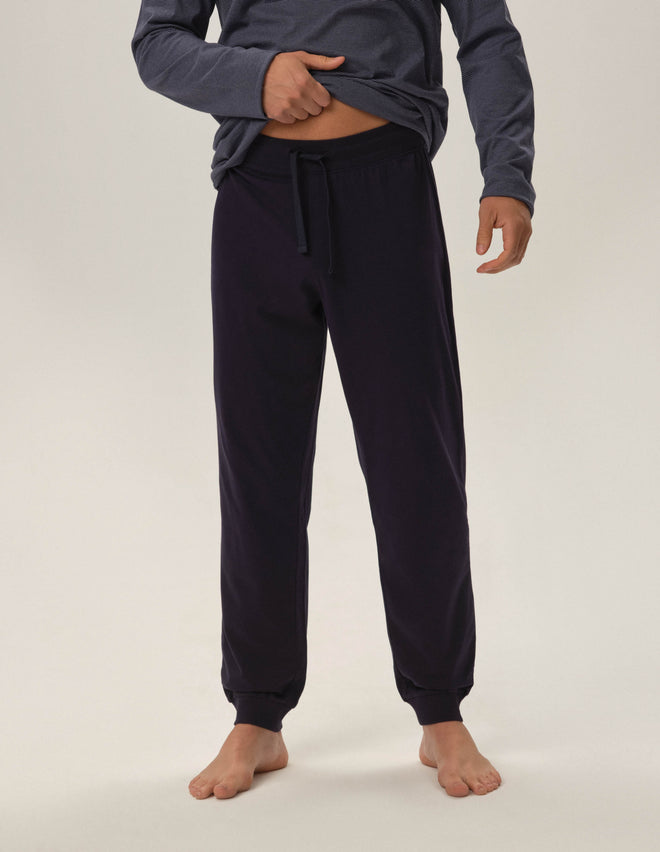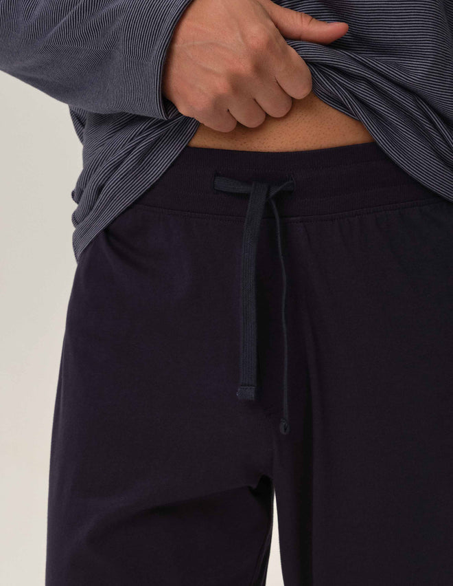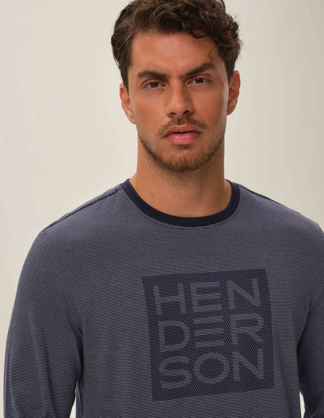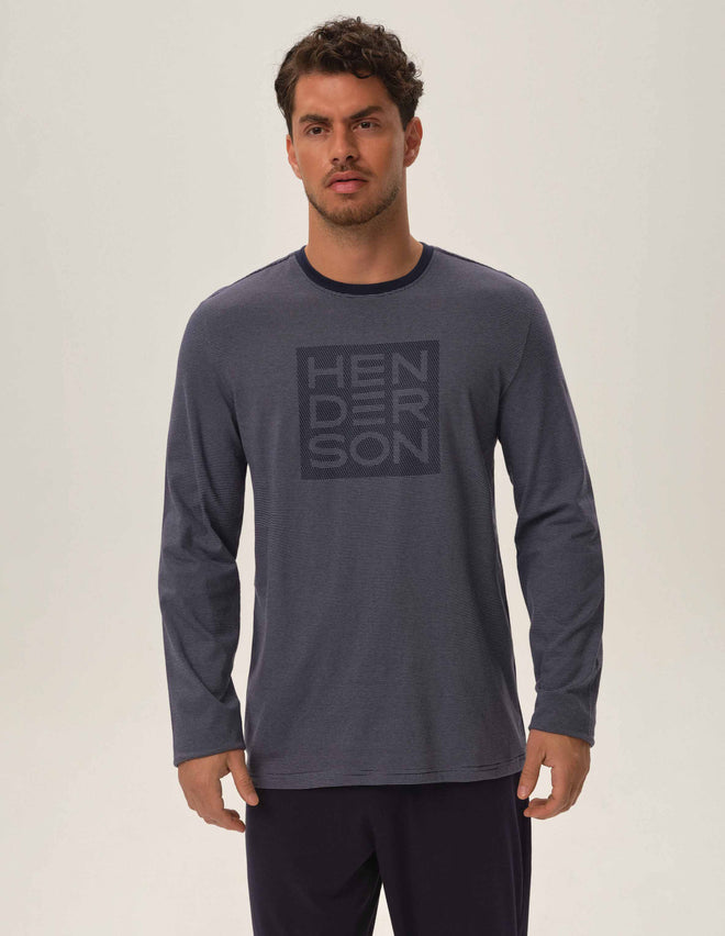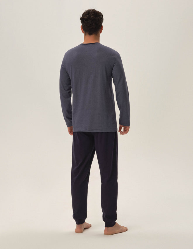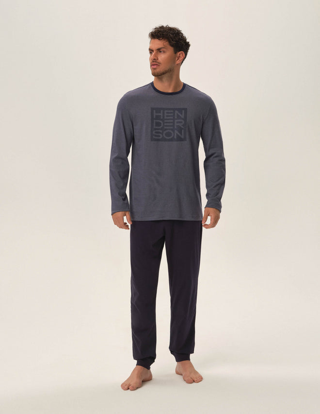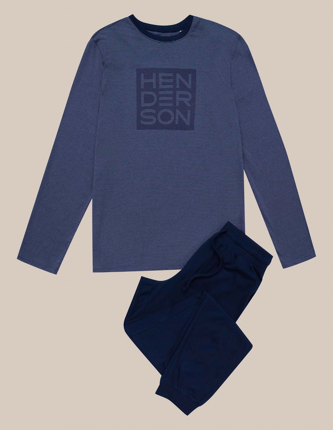 Зручна піжама Jarvis – ідеальний вибір для холодної пори року. Вона створена для чоловіків, які цінують сучасний стиль і стримані відтінки. Світло-блакитна блуза з м'якого трикотажу доповнена витонченим візерунком у смужку та стильним написом на грудях, що додає образу особливого шарму. Комплект доповнюють темно-сині брюки вільного крою з ребристим поясом і манжетами на щиколотках, які забезпечують комфорт і зручність у носінні.